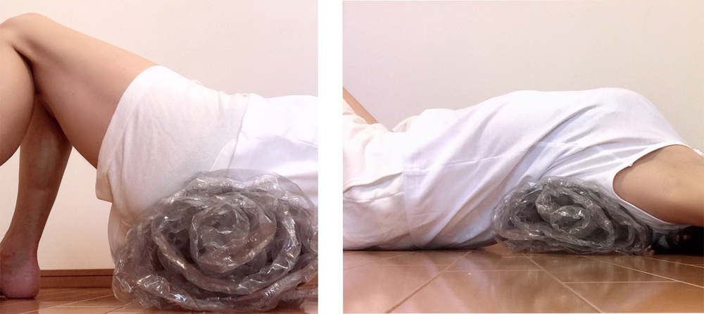 2.お尻を持ち上げて、ブロックをお尻の下に敷きます。(ブロックは横向き)ブロックを腰の下に決して敷かないこと。正確には仙骨部分に当てます。