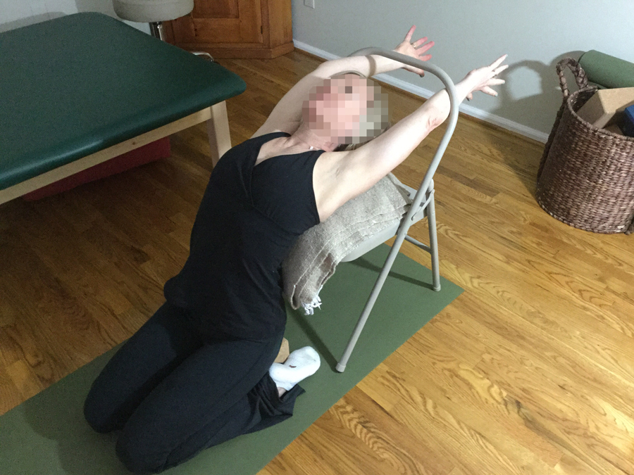 そこで、このポーズの機能面(胸を開く、体の前面を伸ばす、内臓にスペースができる)を優先すると、たとえば下のような形になります。