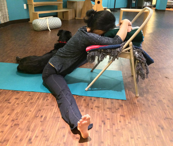 このポーズの機能面、脚を開いて前屈するを優先するなら、たとえば下の写真のようになります。この姿勢のまま、ゆっくりと呼吸をすれば心は自然と落ち着いて行きます。もちろん脚は、こんなに開く必要もありません。