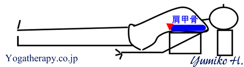 とりあえず今すぐ試してみたいという方は、厚めのバスタオルを二枚重ねて、まず半分に折ります。それをクルクルと固めに巻いていきます。巻きずしを作る感じです。それを床に置き、肩甲骨に少し引っかかるあたり(下図参照)に、そのロールが来るように仰向けに寝ます。膝を立てて、すこし足で床を遠くに押します。するとロールが少し腰側にずれると同時に背中の皮が引っ張られて、同時に胸がより開く感覚が得られると思います(この時点ではロールは既に肩甲骨に乗っていません。)。腕はTの字、脚はまっすぐに伸ばしますが、腰が反ってしまうようであれば膝は立てたままの方がいいです。ゆっくりと静かに深い呼吸を繰り替えします。