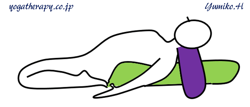 ヨガを日常やっている方で膝に問題がない方は「仰向けの英雄のポーズ」がお勧めです。(正座が苦手な人は止めて、上記のポーズにしましょう。)緑の部分はヨガに使うボールスターです。ない場合は、お布団とか座布団が利用できるかもしれません。お尻はボールスターの上に乗せボールスターの前に座ってください。腰がアーチしすぎるようであれば、お尻の下に座布団などを敷いてください。紫はヨガブランケット(またはバスタオル)を巻いて首が楽なように枕にしてください。腕を頭上に上げて上半身をぐぐ~っと伸ばすようにしてみてください。深い呼吸を続けてください。体の前面、特にみぞおちの辺りが、ぐぐっと伸び、胃から食道も一緒に引き伸ばされる感覚を味わってください。私の場合は、以上の方法のどれか一つ、または組み合わせることで大抵の胸焼けは10分以内に消えて行きます。