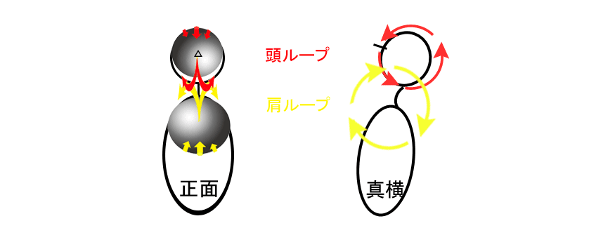 一方、頭ループ(赤)は、上あごの中心から始まり、頭の後ろから頭のてっぺんを通り、顔の前面を下がって、再び上あごの中心を通ります。