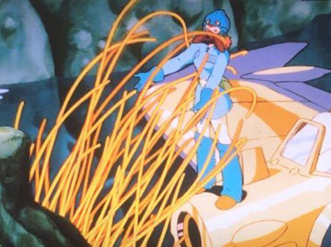 腐界に住む王蟲(オウム)というダンゴ虫のような14個の目をもつ巨大生物は高度な知性を備え、深い精神文化をも持っています。破壊を争いを繰り返す人間に怒り目を真っ赤にして大群で、人間の居住地襲いかかろうとしますが、ナウシカが、その身を差し出すと、王蟲は触覚でナウシカを包み込み、その触覚を使ったコミュニケーションによって、ナウシカが全く危険ではない安心安全な存在であることを悟り、その怒りを鎮めます。(宮崎駿さん、凄いです。)