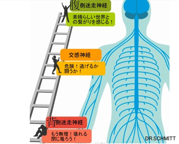 つまり、私たちは、まずはコミュニケーションをとって解決しようとします。(「話せばわかる。」の段階で「社会交流系(腹側)」が優位。)でも話し合いで解決しないとなると、臨戦状態に移行します(「問答無用の切り捨て御免状態」で闘争か逃走か「交感神経」)。戦うことも逃げることもできないところまで追いつめられると最後の不動化になります。(もう無理。不動化の「背側」)
