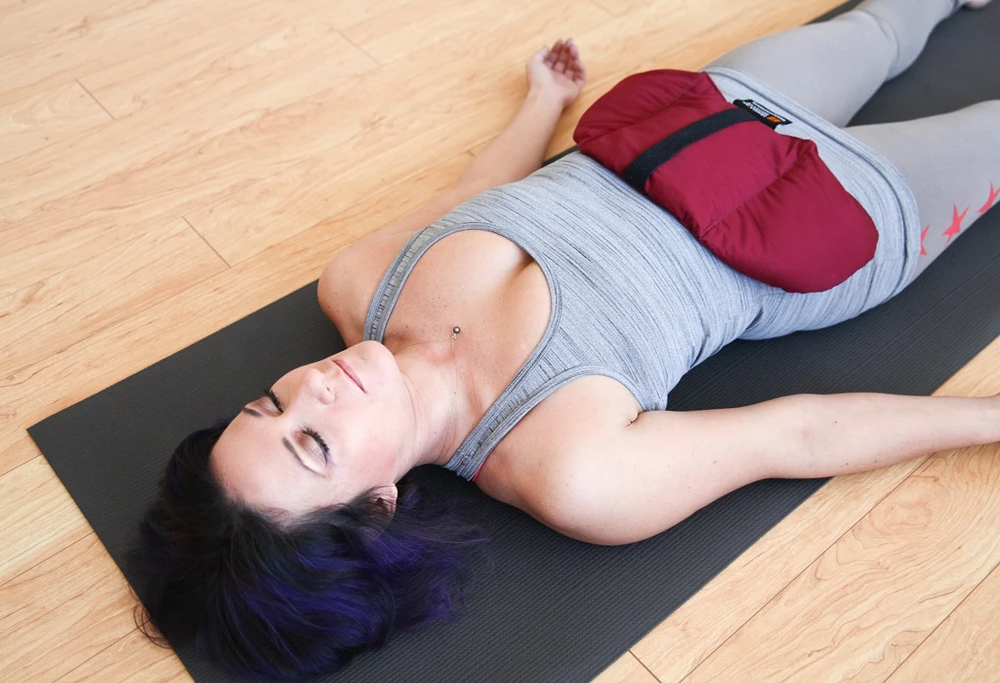 ヨガセラピーでは、ヨガブロックだけでなくヨガブランケット、ストラップ、椅子、ボールスターなど、さまざまなツール(道具)を使いますが、その中にサンドバッグというものがあります。ボクシングのサンドバッグとは違って通常、写真のように長方形の布でできている袋に砂が適度に入っています。