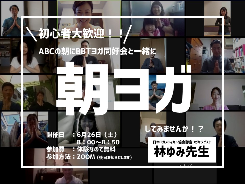 BBTヨガ同好会は、BBT内で数ある同好会の中でも、活発に活動している同好会ですので、OB会実行委員長より今年のOB会ではBBTヨガ同好会主催の朝ヨガ(オンラインレッスン)を開催して欲しい由、依頼が御座いました。