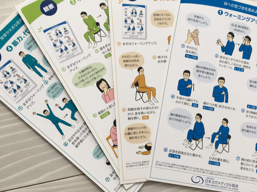 A4のクリアファイルに、表面ウォーミングアップ、裏面安心椅子ヨガ、間に他の2種を挟み込み、会場でお渡しすることとしました。