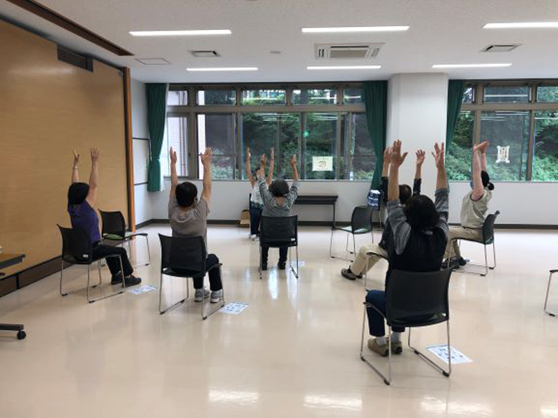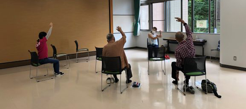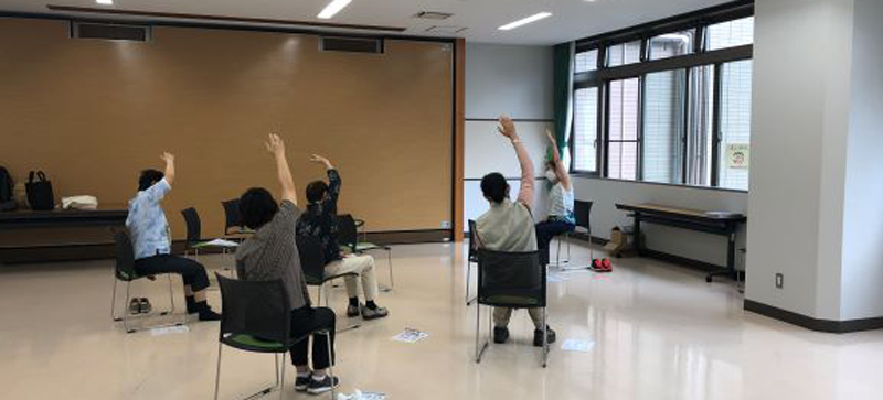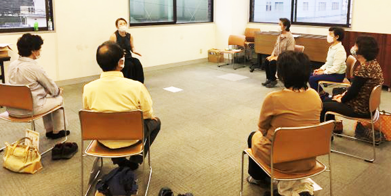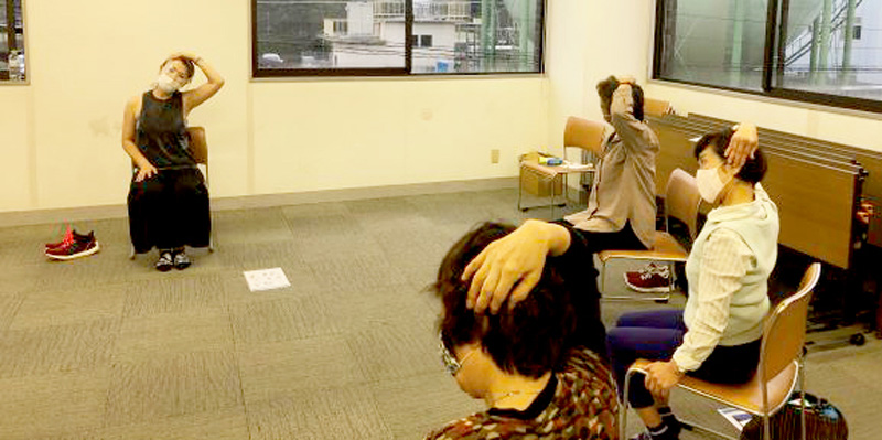 反省点としましては、当初から想定しておりましたが、五月雨式に出入りのある状況ですので、繰り返しのプログラムを一人で続ける、ということと、やはりご高齢の方対象で、中には少々お耳の聴こえづらい方もいらっしゃると声が大きくなってしまい、6日間の後半では、私の喉のケアが必須となりました。マスクとフェイスシールドも、わかりやすい声を出すには、ハードルとなりました。参加者が少なければ、休み休みゆっくりやっていけば良いかな、と思っていました。一定の休憩時間も考えましたが、たくさんの皆さまにご一緒いただく中、休憩中の退屈や早々に退室されてしまうとせっかくの機会を逃してしまいますのと、会場に人が増え密になってしまうことも危惧されましたので、基本的に休憩時間を設けず、続けていくことにしました。