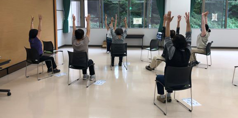 メディカルヨガのご紹介、呼吸法をお伝えし、ウォーミングアップ、安心椅子ヨガの中から、上半身下半身の動きをご説明しながらご一緒いただく、概ね20分前後で、1周するプログラムを参加者の皆さまの状況に合わせて繰り返し行いました。