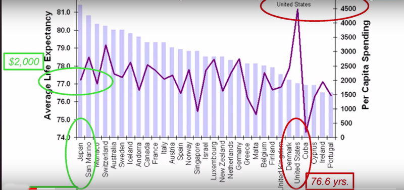 アメリカは、糖尿病、ドラッグによる死、薬の乱用が世界No.1の国であるという問題意識を元に、最初に日本の平均寿命と、医療費の年間コストが米国のそれと比較されました。
